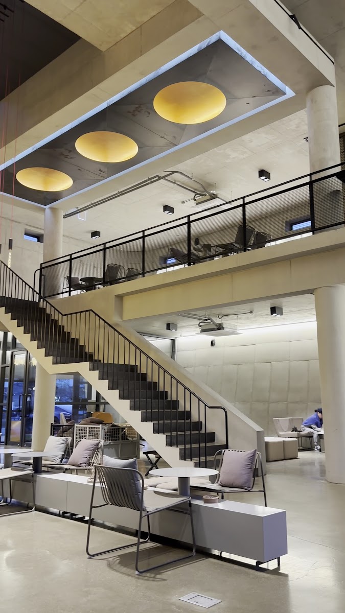 As you step inside, you’re greeted by a spacious, two-story venue adorned with sleek concrete finishes and expansive windows that overlook a beautifully manicured garden. The natural light pours in, creating an inviting atmosphere that encourages both quiet contemplation and lively conversation. The design strikes a perfect balance between modern chic and cozy comfort, making it the ideal spot for both work and leisure.